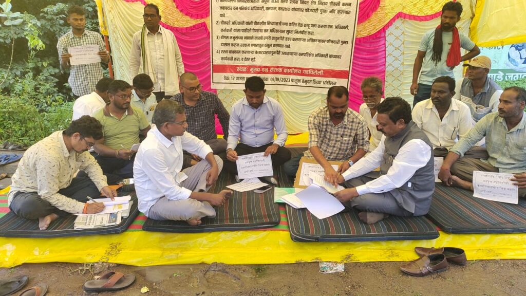 आलापल्ली वनपरिक्षेत्रांतर्गत येत असलेल्या झिमेला, तलवाडा, आलापल्ली या उपक्षेत्रात गुरे प्रतिबंधक चर खोदकाम तसेच अनेक कुप कामात कोट्यावधीचा भ्रष्टाचार करीत आदिवासी मजुरांच्या खोट्या साह्या करून सदर रक्कम परस्पर हडप करण्यात आली असून. या कामाची सखोल चौकशी करून संबंधित वनपरिक्षेत्राधिकारी, वनरक्षकांना तत्काळ निलंबित करण्याच्या मागणीला घेऊन योगाजी कुडवे यांच्या नेतृत्वात आंदोलन सुरू आहे.