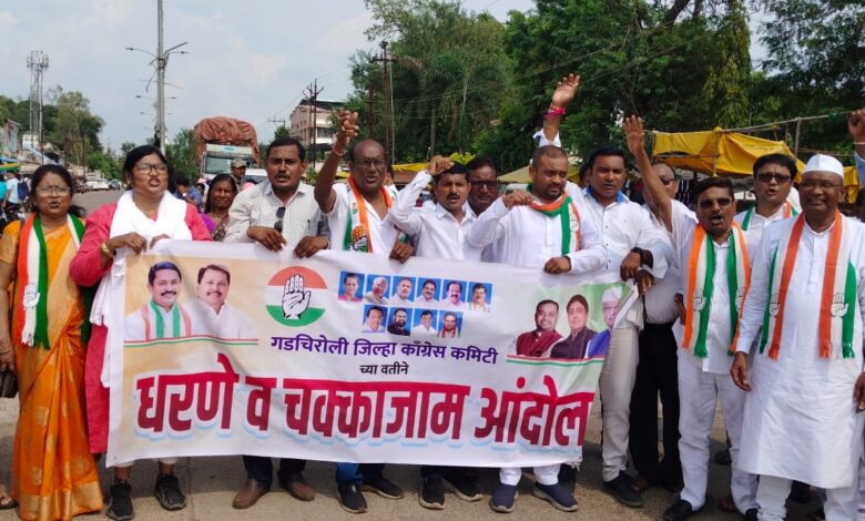 गडचिरोली जिल्हयातील राष्ट्रीय व राज्य महामार्गांची दुरावस्था झाली असल्याने नागरिकांना असह्य त्रास होत असून अनेक निष्पाप नागरिकांचा जीव जात आहे. त्यामुळे जिल्ह्यातील रस्त्यांची तातडीने दुरुस्ती करण्यात यावी यासाह इतर प्रमुख मागण्यांना घेऊन गडचिरोली जिल्हा काँग्रेस कमिटीच्या वतीने जिल्हाध्यक्ष महेंद्र ब्राह्मणवाडे यांच्या नेतृत्वात, खासदार डॉ. नामदेव किरसान यांच्या प्रमुख उपस्थितीत धरणे व चक्काजाम आंदोलन करण्यात आले.