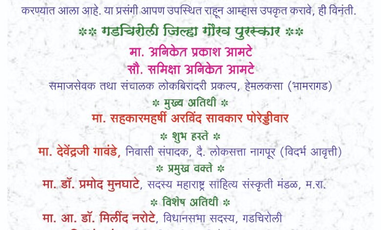 पत्रकार दिनाच्या निमित्ताने प्रेस क्लब गडचिरोलीच्या वतीने ‘गडचिरोली जिल्हा गौरव पुरस्कार प्रदान सोहळा’ व ‘गीत गायन स्पर्धेचे बक्षीस वितरण’ कार्यक्रम दि. ६ जानेवारी २०२५ रोजी जिल्हा मध्यवर्ती बँक सभागृह, धानोरा रोड येथे दुपारी २ वाजता आयोजित करण्यात आला आहे. या विशेष कार्यक्रमात लोकबिरादरी प्रकल्प हेमलकसा (भामरागड) चे संचालक आणि समाजसेवक मा. अनिकेत प्रकाश आमटे व सौ. समिक्षा अनिकेत आमटे यांना ‘गडचिरोली जिल्हा गौरव पुरस्कार’ने सन्मानित करण्यात येणार आहे.