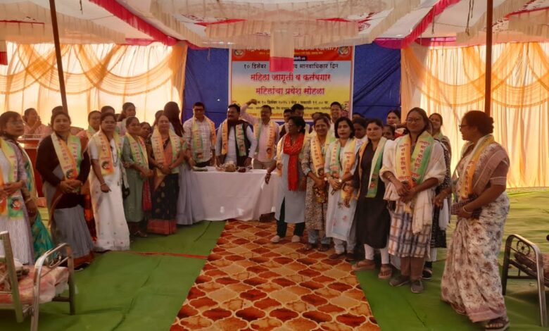 गडचिरोली येथील नवेगाव कॉम्प्लेक्स येथील शहीद वीर बाबुराव शेडमाके अभ्यासिका समोरील मैदानावर राष्ट्रीय मानवाधिकार संघटना जिल्हा गडचिरोलीच्या वतीने आंतरराष्ट्रीय मानवाधिकार दिन निमित्ताने महिला जागृती कार्यक्रम व कर्तबगार महिलांचा संघटनेत भव्य प्रवेश सोहळा आयोजित करण्यात आला या कार्यक्रमाचे अध्यक्ष नामदेव उसेंडी माजी आमदार गडचिरोली विधानसभा क्षेत्र,उदघाटक प्रशांत वाघरे माजी जिल्हाध्यक्ष भाजपा, प्रकाश गेडाम जिल्हा महामंत्री भाजपा,सह.उदघाटक चंदा कोडवते, भारत खटी प्रदेश उपाध्यक्ष राष्ट्रीय मानवाधिकार संघटना,प्रमुख पाहुणे डॉ. प्रणय खुणे प्रदेश अध्यक्ष राष्ट्रीय मानवाधिकार संघटना,राज्य उपाध्यक्ष राहुल झोडे,सामाजिक कार्यकर्ते विकास वडेट्टीवार,धम्म दीप बोदेले,संजय बारापात्रे,अखिल तायडे,रमेश अधिकारी जिल्हा अध्यक्ष राष्ट्रीय मानवाधिकार संघटना, महिला आघाडी जिल्हाध्यक्ष मनीषा मडावी,कार्याध्यक्ष मंजुषा आत्राम,उपाध्यक्ष नानु उपाध्ये,किशोर कुंडू, दीपक सातपुते,तालुका सचिव दिनेश मुजुमदार, संतोष बुरांडे,लक्ष्मी कन्नाके, सचिव तेजस्विनी भज्जे,कोषाध्यक्ष जाहेदा शेख, प्रसिद्धी प्रमुख पल्लवी आत्राम,गडचिरोली तालुका शहराध्यक्ष स्नेहल मेश्राम,भूषणा खेडेकर शहर उपाध्यक्ष, शहर सचिव राणी गोपशेट्टीवार, शहर प्रवक्ता शीतल मेश्राम उपस्थित होते.