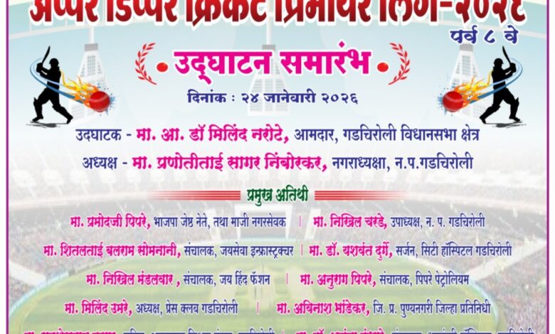 अप्पर-डीप्पर ग्रुप च्या वतीने प्रीमियम लीग २०२६ पर्व आठवे चे उद्घाटन आज शिवाजी महाविद्यालय च्या बाजूच्या गंगुवार पटांगणावर स्पर्धेचे आयोजन करण्यात आले आहे. स्पर्धेचे उद्घाटन आज दि. २४ जानेवारी ला होणार आहे.